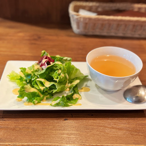 テーブル席は埋まっており、子供連れに老若カップルと土曜の昼らしい客層である。 まず前菜が運ばれ、コンソメスープ。寒い日だったので心まで温まるような一杯。これにサラダは付く。程なくバーグが着皿。 ふんわりジューシーで柔らか目なハンバーグ。で肉感もあり旨い。和牛100%でここまでふんわりなハンバーグはなかなかないな。デミは濃厚そうだけど見た目ほど濃くない。柔らか目なハンバーグは久々な感じ。インゲン、ポテトの付け合わせを挟みつつ、ラストはライスどぼんで、ペロリと完食。 食後のコーヒーが落ち着く一杯でした。