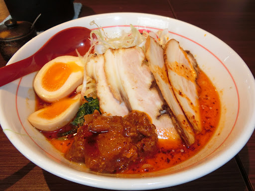 いちばん辛いのはどれですか?ってお姉さんに訊いて食券購入。 赤の鬼辛¥990-、赤大辛トッピング一枚¥200-を購入。 辛さより旨みが勝っていて、旨辛ラーメンでした。 帰り際に店長に訊いてみました。 自分「これ以上辛くできませんか?」 店長「大辛トッピングは何枚でも追加できるので、いくらでも辛くなりますよ。」 !?! 自分「今までどれだけ辛いの食べた人居ましたか?」 店長「最高で大辛トッピングを3枚ですね。」 自分「じゃあ次は、記録は更新に来ますねーー!」 店長「お待ちしてまーす!」