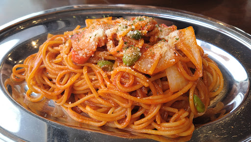 Read more建物は新しめですが店内は昭和の雰囲気です。専用駐車場はありません。 お昼は県庁や県警の方々で賑わいますが13時近くになると一斉にさぁ~ッと空いてきます。 テラス席1卓は喫煙可能なようです。 ランチパスタはサラダ、スープ、1ドリンク付です。 レギュラーメニューは200円でサラダ、1ドリンク付きます。 ナポリタン好きなのでレギュラーメニューからオーダー。楕円のステンレスプレートで盛られてきました。 ハム、玉ねぎ、ピーマンの他に枝豆を発見。食感も相まってなかなか美味しい。ハバネロソースはけっこう辛いので調整しながらふります。 会計は現金のみです。 店内には漫画が置かれ、1970年代のPOPEYEが…HotdogPressあるかな??懐かしすぎます。また(13時過...