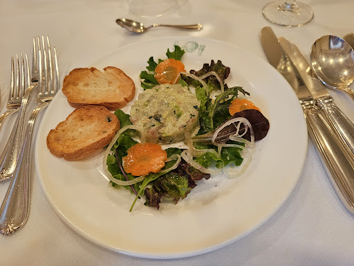 Read more会食で初めて利用。10月限定のランチコース¥3,000をお願いしました。HPに料理の内容はなく、こちらも特に聞かなかったのですが、よくあるように前菜盛り合わせとメイン、デザートだと思っていました。 奥のゆったりした半個室に通され、マダムに苦手な食べ物を聞かれて、期待はいよいよ高まります。 で、まず出てきたのは皿いっぱいの豚肉のグラタン。前菜にしては重いぞ…と思いつつ、まあ美味しかったので平らげました。その途中でキャロット・ラペ登場。まあ美味しいけど、家で作るほうが人参を細く切るので食べやすい。硬くてみんなちょっと苦戦気味。 パンとバターもありましたが、メインを食べ切る自信がなかったので手をつけずにいたら下げられてしまいました。 不安的中。このあとはデザートのキャラメルプディングとコーヒー。で、おしまい。 これってコース? いや、定食では? レビューがよかっただけに、ちょっとがっかりな会食でした。 ただ、お土産に買ったリエットはタイムが...