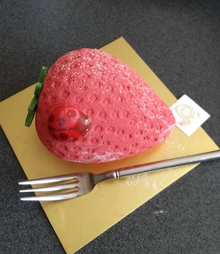 イチゴのケーキは、イチゴのムースでコーティングされた中に濃厚なイチゴのジャムを挟んだ優しいスポンジ生地。 そこに代々木上原「365日」のチョコパンみたいな丸っこいツブツブが中に入ってて、食感のアクセントになってます。 てんとう虫がカワイイですね。 (写真撮るのヘタでごめんなさいです〜)