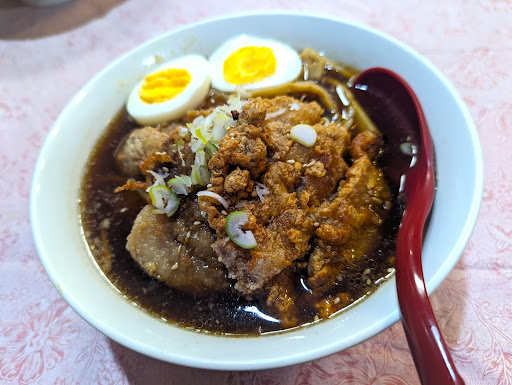 この永楽亭は、かつて天台駅近くにあった「永楽亭(閉店)」ののれん分け店的存在。永楽亭天台店で僕が死ぬほど大好きだった「パーコーラーメン」がこちらの都町店にもあるんです。ラーメン好きの人には、是非ここのパーコーラーメンを食べていただきたいです。醤油強めの背脂醤油豚骨スープに、豪快にパーコーが盛られています。スープもかなりマニアックにパンチがありますし、パーコーも強烈な味わいです(野性味強め!)。