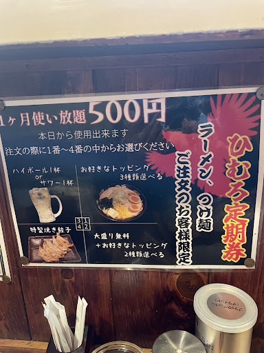 It's a simple joint where you come in, order by ticket and sit at the counter. It's mostly for commuters and workers for a quick stop. For that it looks a little bit run down, but not too much that it hinders you from enjoying the food. The most popular ramen is currently (April 2023) 930 yen, so not the cheapest in my opinion, but doesn't break the bank. The ramen itself is alright, it's enjoyable but nothing out of the ordinary. It was a bit too oily for me though.