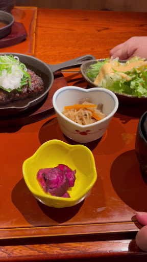 ランチタイムにおじゃましてきました。 近江牛のハンバーグが、ご飯、サラダ、小鉢、お新香と、お味噌汁がついて1,000円!