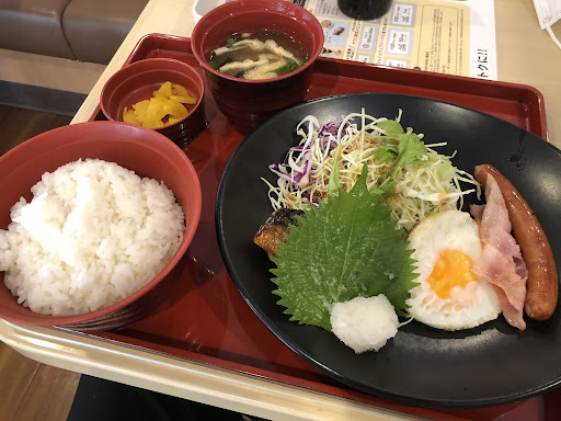 The seasoning is family-less, but the sausage, bacon 🥓, grilled mackerel with salt, fried egg 🍳, and shredded cabbage are all good.