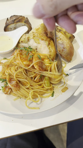 Main cause, you have an option to choose which pasta you want (many options to choose from), with grilled chicken, grilled potatoes and 2 slices of baguette.