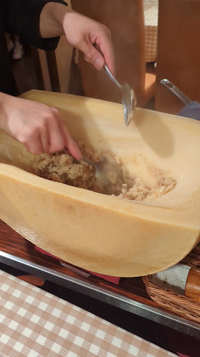 それと帰り際に大きなパルミジャーノレッジャーノのチーズの固まりからとろけたチーズのリゾット(ポルチーニリゾットかな?)をよそっているのを見まして、ちょと...