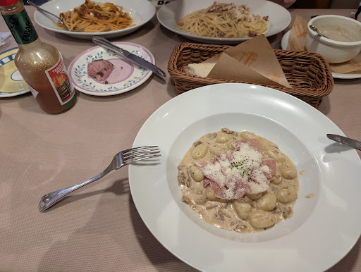 妻はミートソースパスタを一口口に入れ、まずしょっぱいっ。 子供は当店一番人気のカルボナーラに店員さんがインパクトを強調するどでかペッパーミルで胡椒を入れる、その後食べるもなんかしょっぱい。。。 カルボナーラでハズレはないだろと思い、私も一口食べさせてもらったが、なぜしょっぱい。 私のニョッキも一口目の印象はクリームソースがしょっぱいというより塩辛い。 しかも生ハム付きです。。。。わかります? どういうメニューだこりゃ、とツッコミたくなる。 10代、20代ならごまかせるでしょうが。 ドリンクを頼まなかった罰か、頼ませるためか、私も商売人なので疑ってしまいます。