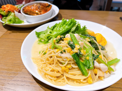 日替わりパスタは、小松菜、貝柱、コーンのオイルパスタでした😍 野菜もたっぷり乗っていて最高❣️ 美味しかったです😄👍🏼