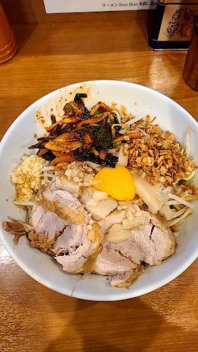Read moreラーメンBooBoo太郎。 汁なし ニラキムチ 半年ぶりのBooBooにもん絶😂 ・ どーも🙇susumuでーす❗ 葭川公園大好き💕ってことで相変わらずやってるんですけど、今回は半年ぶり。千葉で最も直系二郎に近いとされる二郎インスパイアのお店。 こちら❗どーん‼️ 千葉都市モノレール葭川公園駅から徒歩6分くらいのところにある「ラーメンBooBoo太郎。」さんにお邪魔してまーす🎵 ・ 13時半過ぎ。葭川公園。 「豚食べたい🐷」 気づけば千葉みなとから千葉都市モノレールに乗っていた。 昼営業は14時までだ。間に合うか⁉️ モノレールから見下ろすと… 「うわぁ~💦行列…😳」 千葉にも二郎系と言われるお店が増えたけど6年目に突入したこちらの人気は安定、どころか勢いを増しているようです。 「ラーメンBooBoo太郎」さん😎 中待ち9名。外待ち16名に接続。 千葉市のヤンチャなオニイサン達に紛れ浦安市のオジサンも大人しくその時を待つ。。。 40分後。遂に入店🙋♂️ 食券制でーす🎵 アカボシマシマシtvでアカザキさんが"ウマイ"とおっしゃっていた「汁なし」をチョイス🎵 「ニラキムチ」もプッシュして中待ちに接続。 以前あった椅子の上は荷物置き場になっており中でも立ち待ち😅 「食券見せてくださーい❗」 「麺量少なめ、半分ありますかー❓」 @susumu7424 「少なめー」 とかお伝えしつつ更に10分後着席‼️ まったく久しぶりに土日共に行列疲れだぜ~😩 とか思いながら待ってると~🎵 「汁なし少なめの方。ニンニク入れますか?」 @susumu7424 「ニンニクアブラ♥️」 ・ ムハァぁ~~~~ん💕 ご覧ください‼️美しい豚ですね~♪彩りが不足していた前回の反省を踏まえて追加した「ニラキムチ」が良い仕事してるねぇ~😍 それではまぜまぜして早速いただきま~す🙏 どりぇりぇぁぁああ💕💕💕 う、う、うめぇ…😭 ちょい柔めの平打ち中太麺に絡みつく卵黄、BP、フライドガーリック👍 ヤサイはキャベ率高めのシャキシャキタイプで@susumu7424...