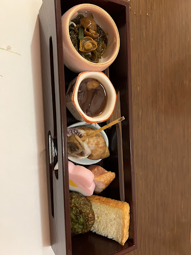 8th course - Dessert. edamamae sauce over red bean paste with a piece glass jelly. I don't eat dessert in general due to health concerns, but I finish it all because it is so yummy. With a cup of hot oolong tea, it completed the perfect meal.