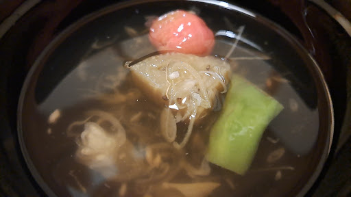7th course - summer vegetables puree on a bed of rice with pickled eggplant. The vegetable puree is refreshing and with a bit of slimy texture (just a little bit). The color of the puree is bright green, and it excites your appetite before your tongue ever touches it. The pickled eggplant is sweet rather than salty. To end the meal, there is a bowl of hot miso soup. So how this hot miso soup gave me the peacefulness after an exciting, heart beating meal.