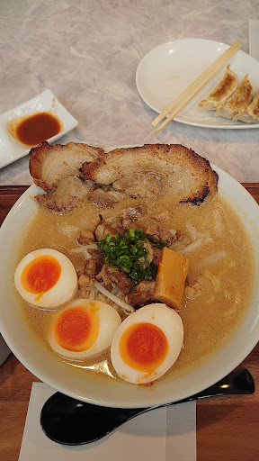今回は下総味噌ラーメン+炙りチャーシュー2枚+味噌味玉+イワシ節&餃子を注文してみました。 下総味噌ラーメンは初めてでしたが、甘味を感じるとても味わい深いスープで通常の田所商店よりワンランク上を行っている印象、これはとても美味しいです。 具も肉味噌ではなく刻みチャーシューになっていたりとやや高級化されています。 少し食べてからトッピングのイワシ節をふりかけてみましたが、1口目はガツンと魚の味が加わりパンチが効きますが肝心の味噌は消え去ります(笑) そして2口目は今度はイワシ節は忘れられて味噌味が復活します。 しかしイワシ節に削がれたのか味噌の甘みが薄れて何とも弱いスープになってしまった感じでかなり残念。 やはり両方いいとこ取りは難しいようで、魚介系ラーメンを食べたかったらそれ系のお店で食べた方がいいですね。