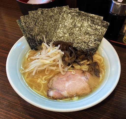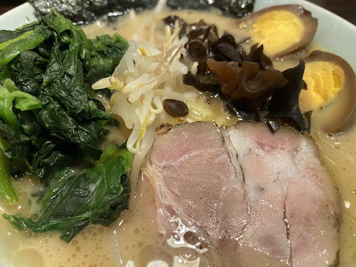 味はしょうゆの濃さで誤魔化していない醤油豚骨 千葉市の家系では1番好きな味でした 具材はのり3枚、モヤシ少々、きくらげ少々、チャーシュー1枚 ほうれん草はトッピングと記載されていました