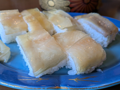 板昆布を身に纏った岩魚は川魚独特の臭みがありませんでした。 身は柔らかくて美味しいです。 押し寿司にありがちな酸っぱ過ぎる酢飯がありません。 米の甘味を引き出す酢は「赤酢」を使っているためのようです。