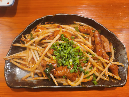 * ホルモン炒め(680円) 濃厚かつ少しピリッとしたタレが素敵な一品。ホルモンの癖も少なく、モヤシはシャキシャキ。ビールとご飯に絶妙に合う一品ですね。熱々の内に食べきることをお勧めします!