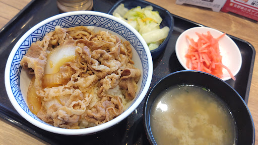 初めて来店した。他の吉野家と違い、はじめに正面のレジで先払いして注文するスタイル。あとから気づいたが、入り口の床に矢印が描いてあった。しかし、視線はそこにはいかない。