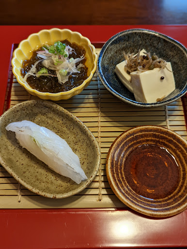 Read more初訪問 妹が美味しいということで 妹と一緒に行きました。 予約して13時前に到着。駐車場は店前に二台と裏の駐車場三台分 カウンター席とテーブル席がありました メニューはおまかせ定食等アラカルトがあります。アラカルトは定食から海鮮類がありました。今回はおまかせ定食3500円ともっとおまかせ定食の4000円、妹が白子ぽん酢900円位とドリンク400円をオーダーしました。 前菜から菊の花お浸し、ひじきの煮物、握り寿司から始まり サラダ、お刺身三点、牛肉の煮込、ローストビーフ...