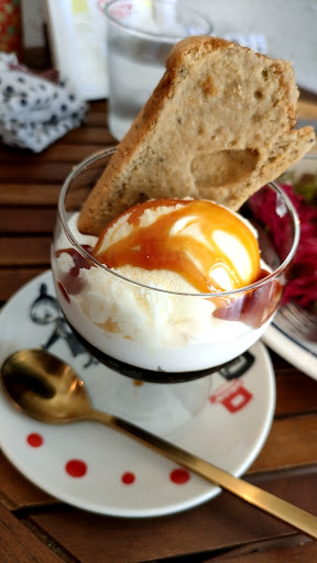 この日はケークサレセットとコーヒーゼリーのパフェを注文しました。 ケークサレには自家製トマトソースがたっぷりかかっていて、見た目以上に食べごたえがあります。ベーコンの風味がとてもおいしい。柿のサラダとビーツのサラダが添えられていて彩りもきれい。 コーヒーゼリーパフェはサクサクのラスクのようなお菓子が刺さっていて、食感の取り合わせが楽しかったです。