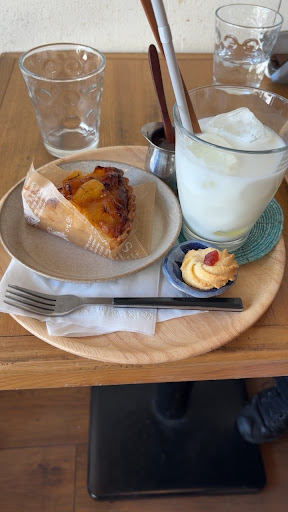 Read more初めて来店 自家製お菓子が食べられる喫茶店みたいなので、鵠沼からの徒歩で帰り道の途中で休憩がてら寄りました 疲れてたので甘いものと言うことで、梅シロップのラッシーとリンゴカスタードタルトを注文 梅シロップのラッシーは、梅シロップ漬けの梅付きでこの梅がしっかり中まで漬かってゼリー状でめちゃ美味しかった❣️リンゴカスタードタルトは、タルト部分が柔らかくて食べやすくて、パクパク食べました✨リンゴの酸味とカスタードの控えめな甘味が作り出すハーモニーが最高✨ ペロッと平らげて帰路へ 往復18.5キロも歩いたので、本当に丁度良い場所にあった止まり木となりまし...