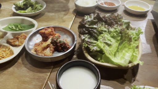 Read more店内は韓国アイドルのポスター、MVが流れていて、若いお客様が多いようです。 チョレギサラダ、海鮮チヂミ、お店イチオシの生サムギョプサル(たれ、しお)をいただきました。 お店の方が目の前に置いた専用鉄板で焼いてくれるので調理失敗がなく、安心していただけます。 サンチュに焼き上がったお肉、キムチ、コチジャン、最後に生唐辛子を乗せていただきます。程よく脂が流れて落ちたお肉がとてもジューシーで美味しいです。しおの方があっさり目でしょうか…。 お肉の旨み、キムチの酸味、コチジャンの辛味をサンチュが上手に包んでくれます。さらに、生唐辛子の刺激的な辛味が良いアクセントになって飽きません。 海鮮チヂミは表面がサクサクに焼き上がり、中からプリプリの海鮮が現れます。これは美味しい!チヂミを頼むのなら海鮮がおすすめです。 ガッツリお肉をいただきたい...