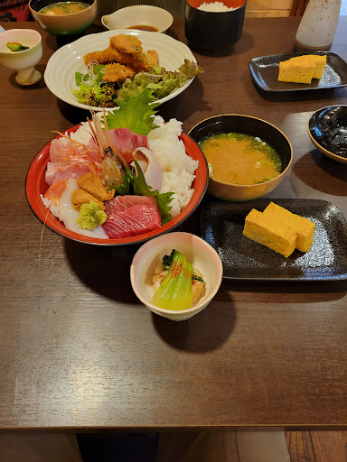 Read moreコスパが凄すぎてビックリ!! 12時前に来店、すでに2組のお客さんが。海の近くの定番、海鮮丼を頼んで、連れは刺身定食。お隣のお客さんが天丼?のようなものを頼んでいて、そのエビの大きさがとても気になり、天ぷらもとても食べたくなりましたが、それはまた次回のお楽しみで、お店は居酒屋で大将お一人。とても忙しそうで、少し待ちましたが、待ったかいがありました。出てきた海鮮丼は1350円で、ウニにキャビアに金目鯛のお刺身、炙りにエビの頭の唐揚げ。こんな豪華な海鮮丼未だかつて食べたことないです。これで2000円といわれたら、値段相応かなと思うけど、1350円でいいんですか?と申し訳なくなるくらい。次は...