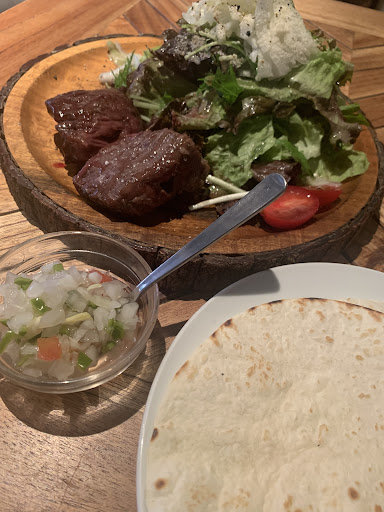 Read more駅から歩いて行ける距離でランチを探してて見つけました。シュラスコが食べれるのは珍しいと思い、来店。 ランチとはいえ、スープと大盛りのサラダが付いてシュラスコ2種で1100円(税込)は安いです。私の時は牛ランプと牛サガリの2種でした。普通選ばせないメニューなら牛以外もひとつ入れてておかしくないのに…ありがたい。 先に出てきたスープはブラジルらしく豆が何種類か入ってて、その他にもセロリやきのこ、トマトも入ってて辛味もそんなにないがスパイシーなお味。塩辛くもなくちょうど良くて満足。 お腹があったまったなーという頃にサラダとトルティーヤ(もしくはライス)が来て、長い串に刺さってお肉も到着。 サラダの盛り具合には驚きましたが、お肉をさっぱり食べるのにはちょうど良かったのかも。 ドレッシングも酸味が強い感じ。 お肉は赤身の部位にも関わらず、柔らかかったです。焼きすぎないミディアムレアなので 赤いのが嫌な人は先に伝えた方がいいかも。 塩梅もちょうどよく、お肉の味を堪能できました。 お肉に刻み玉ねぎのさっぱりしたソースも添えられていて食べやすかったです。
