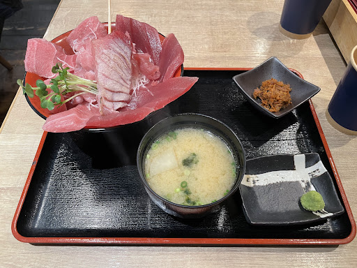 ランチタイムでも予約必須。まさか、そんな制度とは知らず、ふらっと行ったらすぐには入れなかった。幸いドタキャンが出たので、10分待ちで入れたものの、タイミングを逃すと長時間待つことになるから要注意。 この手のメニューを出す店にしては、提供までの時間はかかり気味。注文が入ってから、丁寧に魚をさばいていると思われる。故に待ち時間も長くなりがち。 平日ランチ、ということもあろうが、女性客が中心の店内は、なんともキャピキャピした雰囲気。店内撮影禁止としつつも、食べ物の撮影に余念がなく、お話にも花が咲いて食事はゆったり。故に待ち時間も長くなりがち。 周りを見ていると、注文の中心は刺身。鮪の店と思いきや、アジフライやら鮪以外の海鮮が盛り込まれたメニューが人気。どんぶりは不人気。鮪食べたさに訪れ、贅沢マグロ丼一択と思っていただけに、自分がマイノリティであることに、なんとも心はそわそわ。 予約客への配膳が終わって、さらに後から入った客にも料理が出始める中、丼が届いたのは、着席から20分以上経ってから。どうやら、贅沢ネタは時間がかかる様子。 待った甲斐あって、丼にのったネタは、どれも美味い。添えられた味噌汁には、タコやら魚やら入っており、甘露煮的な物も、なんだかカレーの味がして美味い。 良くを言えば、温かいご飯の上に刺身が乗るのは、やはり心地よくない。酢飯にするか、別盛りの定食バージョンを作るか、していただけたらと願う。 税込みになると1848円。これだけの鮪を食べて、鮪欲が満たされることを思えば安い...