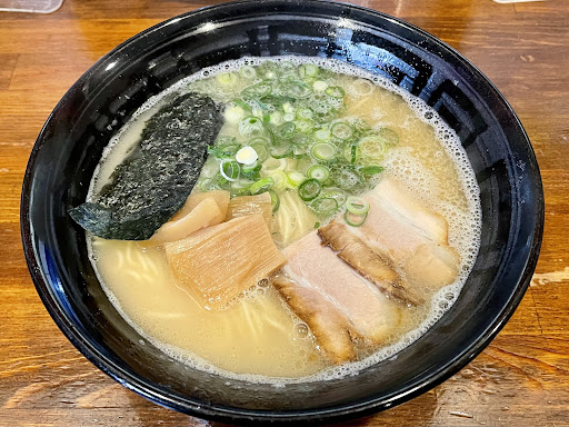 筑後市長浜、福岡県道793号線沿いにあるラーメン屋です。パチンコ店「ユーコーラッキー」筑後店の真正面にある集合店舗の一角に出店されています。見た目通りの小さめのお店で、店内はカウンター席5脚とテーブル席3卓のみとなっています。さて「ラーメン」ですが、塩味が先行する透明感のあるあっさり薄味の久留米系のとんこつスープとなっています。薄味ですが、がつんと豚骨臭が存在を主張しています。麺は中細ストレート麺が使用されており、モチモチとした食感が特徴です。具はバラ系チャーシュー、メンマ、海苔、ネギといった構成の一杯です。塩味が先行する久留米系独特のスープですが、豚骨感は抜群です。大盛り対応あり、替え玉制あり、各種トッピング対応ありとなっています。ラーメンのバリエーションは「野菜ラーメン」「もやしラーメン」「チャーシューラーメン」が用意されています。その他メニューは「餃子」「やきめし」「おにぎり」「めし」程度がメニュー表に上げられています。また居酒屋メニューも用意されており、黒板にびっしりと書き込まれています。おつまみ類が豊富なお陰か、昼間からお酒を嗜むおいちゃん達もチラホラ見受けます。因みに料金の安さもお店の魅力の一つとなっています(2025年夏現在、ラーメン600円、やきめし500円也)。 こちらのお店は、八女市の名店「大晃軒」出身の店長の手により2018年に開業しています。オープンしてからまだ日が浅い頃から既に、店内には俳優「宇梶剛士」さんのサインが飾られていました。何度も来...
