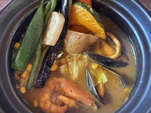 Love this soup version of Japanese curry (spice level can choose from not spicy all the way to very), I had mild spicy which was good. Chose the seafood soup and the scallops, mussels, prawns and squid was very fresh. The carrot was super sweet and I enjoyed all the vegetables including the pumpkin, eggplant, lady’s finger, and corn too! The salad buffet spread was also very good. Must come and eat when you are nearby! Drink the...