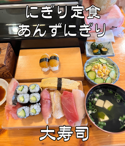Read more千曲市稲荷山「大寿司」で平日ランチの「にぎり定食」1000円とアンズの握り1貫150円を2貫いただきました。 握り6貫に巻物、サラダ、漬物、味噌汁がセットです、安い! ブリ、サバ、マグロはこの値段で食べられるのが素晴らしい。 珍しいご当地メニューあんずの寿司も美味しいですよ、2貫食べて大満足。 次回はランチ海鮮丼を食べてみよう、平日メニュー...