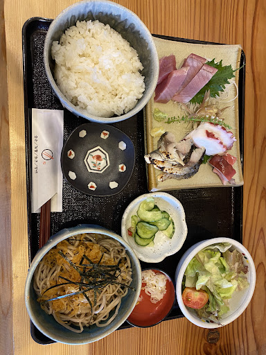 ランチに訪問。駐車場は店の前と、裏手の空き地のようなところ。店内にはカウンターと座敷あり。おすすめメニューの1つだった「刺身定食・ミニ蕎麦付」税込1000円を注文。残念ながらマグロは切れてしまっていて、刺身はカツオ、シメサバ、タコ。カツオが分厚くて臭みが一切なく、全てのネタが新鮮で美味しかった。ゴハンも大盛。何より蕎麦が絶品!その質で1000円は大満足!次回は蕎麦を注文したいと思う。(2021)