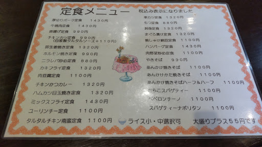 2024.1 初めて伺いました。 夜は、スナックなのかな。 ソファー・テーブルに座り、メニューをみる。 JIMBEAMのグラスに麦茶、冷えてて美味しい。 注文は、 1️⃣タルタルチキン南蛮定食 タルタルソースたっぷりチキン6個。 チキンは、ジューシーで甘辛タレとタルタルとの相性抜群‼️ 美味しい‼️ 付け合わせのマカロニサラダも美味しかった。 ご飯も美味しい。 味噌汁は、白菜・大根・茄子・豆腐が沢山入ってて良い出汁でている。 キュウリのピリ辛漬けもパリパリで美味しかった。 ヒジキの煮付け、プリンも美味しかった。 大満足のランチでした。