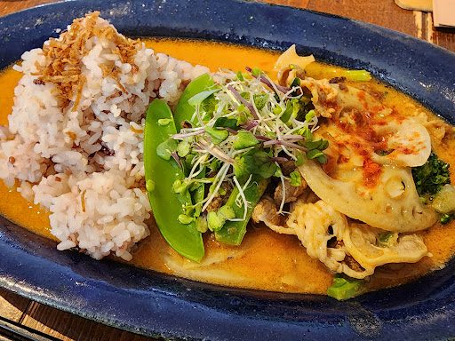 2色のカレーセットとサラダプレートのセットを注文。 カレーはどらちも凝っているのは分かりました。バターチキンは美味しいと思います。しかしながら定食気分だっため… サラダプレートはピクルスやクリームチーズのポテトサラダ?などがのっており、またドレッシングも自家製のバジル系のみで好みではありませんでした。