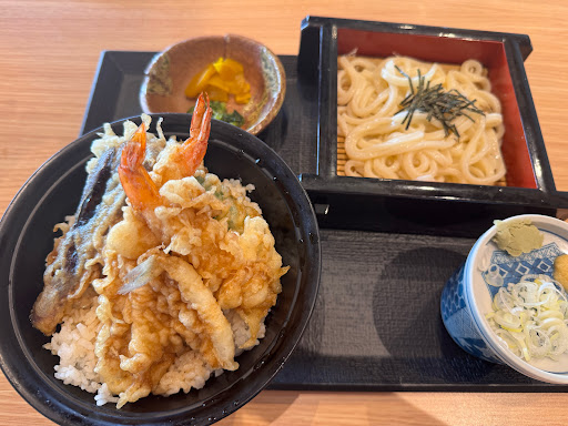 さくら御膳は思ったより豪華!天ぷらがあるので天丼にしなくて良かった(笑) 最初にサラダから食べましたが野菜がうまい!ミニヒレカツ丼はご飯一杯に大きめのヒレカツが1枚、味付けはやや薄味で普通。うどんは冷たいのはおろしと天かす、ネギでさっぱり!こちらも腰は弱めでも悪くはない。 天ぷらはエビはイマイチ、舞茸、ピーマンは普通。これに茶碗蒸しとデザートでお腹いっぱい♪ 帰りに子供がじっくりおもちゃを選んでたら…さらにお菓子の詰め合わせ...