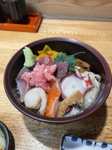 Read more戸を開けると,若い板前さんの威勢のいい声がかかってきます.この辺は無口な店主が多いので珍しい. 海鮮を中心にした季節料理屋らしく,ランチも海鮮丼(1000円)がメイン. ネタは,マグロ,しめ鯖,イクラ,鮭,蒸した魚,玉子焼き,などなど豊富に入って,質もいいです. 漬け物,味噌汁,フルーツ,コーヒーが付きます. 難を言えば,大きなお椀に入ってくる味噌汁が薄すぎて味がしないくらいかな. 寒いので熱燗も頼んだら,+760円.やはりこういう店での酒は高いですね.お通しは白子....