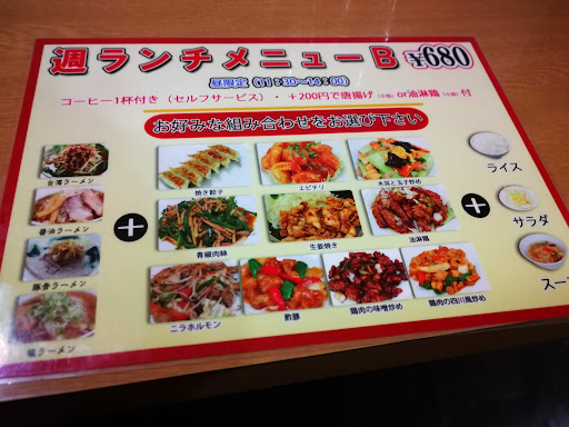 Read moreサービスデーが月曜日で台湾ラーメン、チャーハンなどが300円です。コスパはとてもいいです。駅チカですが、駐車場も付いています。 量が食べたければ、ラーメンとチャーハンで600円ですのでこちらをおすすめします。 味は普通。 お昼の平日ランチタイムに行ったのですが、定食が各種ラーメン+主菜(青椒肉絲や唐揚げ、餃子など)+ライスとスープとサラダがつく。とメニューに書いてありました。 青椒肉絲のセットにはサラダとライスは付いてきましたが、餃子にはライスが付いてきませんでした。 メニューにはそう書いていなかったので、店員さんに聞いてみたらさも当然のように、餃子にはライスは付きませーん。と料理が運ばれて来たあとに言われました。 注釈が付いていないので要注意です。(それにしても餃子とラーメンだけってちょっとご飯欲しいと思うのですが・・・) そういう書いていないイレギュラー性があるので料理を頼むときは事前に聞いてから注文したほうが無難です。じゃないと不満しかたまり...