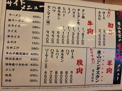 サイドメニューは少ないですが、ジンギスカンの東山に文句を言っちゃぁいけません。とにかく一度ジンギスカン食べて下さい🎵 昔ながらの焼き肉食堂なので、最近流行りのお洒落な韓国焼肉を期待して行くとあてが外れるかもしれませんが、そこは郷に入っては郷に従えの精神で広い心を持って行きましょう💕