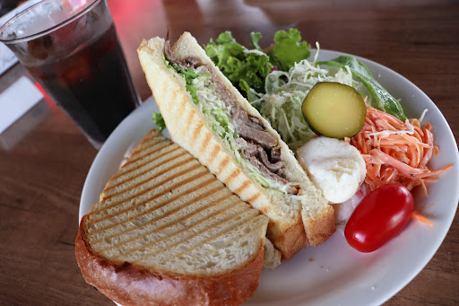 クチコミでホットサンドが美味しいとのことだったので、ホットサンド(ポーク)と、暖かいものが欲しかったのでオニオングラタンスープ、カフェラテを注文。 夫と2人で分けることに。