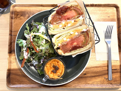 ランチセットの39サンドランチセットは、39カフェオリジナルサンドイッチ。 フライドトマト、ベーコン、ゆで卵、きゅうり、レタスがたっぷりと入って、パンパンになった逸品です。これを、かぶりつくと口内でそれぞれの味と食感が見事に調和して、多幸感に包まれます。 チリソースが苦手な方はケチャプに変えてもらえますし、マスタード抜きも出来ます。 キャロットラペのスッキリとした酸味が、和食の香の物のように良い仕事をしています。