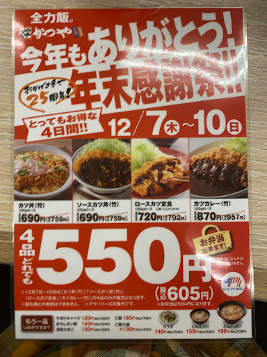 2025/8追記 かつや感謝祭にひかれて平日の17時頃に伺いました。 お客さんは感謝祭の為かテーブル席は満席でカウンターのみは空いており、持ち帰り客が入り口に数人いました。