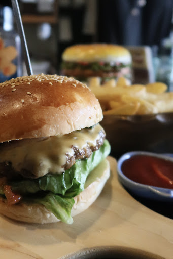 Read more新舞子でぶらーっと旅に来て、近所の食べ物屋さんを調べていたら発見。寄らせていただきました。 外からは立地がら、サーフショップの一部かな?って感じですが中は全然。アメリカンダイナー100%って感じのオシャレなつくりです。うん、映えまくりだね! 壁には有名人のサインもいっぱい。こーいうのあると期待値上げちゃう庶民タイプなので、ハズレを引かないよう慎重にメニュー選びを。 地元の知多牛つかったパティが売りだそうで、知多牛バーガー990円にオニフラセット600円、ドリンクはグレープフルーツ100%で注文。 平日の13時前ですが他に客はいなく(前の道路も歩いてるのはサーフィン上がりの方1名だけでした)、10分も待たずにやってきました。