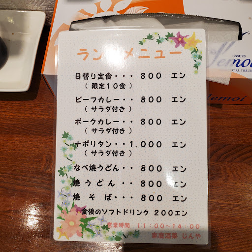 家庭酒菜じんや 2024/07/09訪問 千歳市にあります、「家庭酒菜じんや」さんです。 住宅地の中にひっそり佇む隠れ家的な店舗です。 しっかり確認して行かないと辿り着かない可能性があります。 お昼はランチ営業、夜は居酒屋として営業されているようです。 家庭的なお店で女性スタッフ1人で切り盛りされているようでした。 日替わりランチは毎日10食限定のようです。カレーや焼うどん、ナポリタンもありました。 店内はカウンター席とテーブル席があり、とても清潔でお洒落なお店です。 今回は、ランチ利用しました。 安価でボリューム満点、とても美味しかったです...
