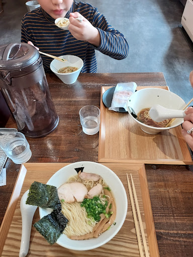 健康診断の帰りに寄りました。 10時過ぎだったからかお盆だったからかは分かりませんが先客はマダム4人組だけ。 入店時に注文をして現金で支払いをします。 基本は注文票にチェックする感じらしいのですが手が空いてたのか店主さんが受けて下さいました。 朝昼兼用でおおきにセット(塩:1400円)を注文。 一人なのでカウンターに座りました。 内装はオシャレなカフェみたいな感じ。 店内の広さに対して座席数はそれ程多くはなく、行列ができても快適に過ごせそうな贅沢な空間になっています。 配膳はしてくれますが返却はセルフみたいです。 10分位で配膳されました。 透き通った塩のスープに比較的角のないストレートに近い麺、それに鶏チャーシューなのですね。 他にメンマ、青ネギ、海苔が2枚。 牛めしのアタマは牛肉と玉ねぎ。