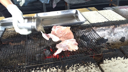 The system here is that you buy a raw half chicken, mixed vegetables and rice (the only three foods on the menu) and grill the chicken over a coal fire pit while sweating profusely. The end result is a good meal and some very good stories.