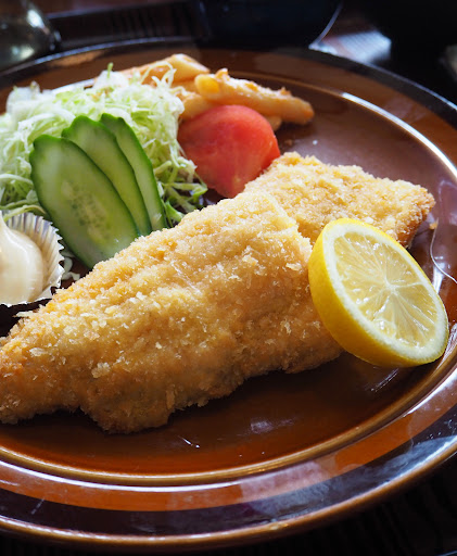 フライ定食は、フライ2枚、サラダ、切り干し大根、味噌汁、ご飯、たくあん2枚とシンプルとシンプルだがある意味洋食屋の食べ物みたいで、観光地の大衆食堂の料理にしてはかなり立派。外のフードサンプルでは一匹丸ごとだったが、実際に出てきたヒメマスは、大きい切り身が2枚。豪快さにはかけるが、切り身の方が食べやすい。そらく冷凍だと思われるが、まぁ〜安いのでその辺はあまり深く考えないことにした。揚げ具合もふっくらとしており、うまく上がっている。これがひめますかぁ〜という感動に浸る。出てきたソースはウースターソースでちょっとだけつけると美味い。同じ皿に盛られたマヨネーズをつけても美味い。ご飯半ばで満腹になる。