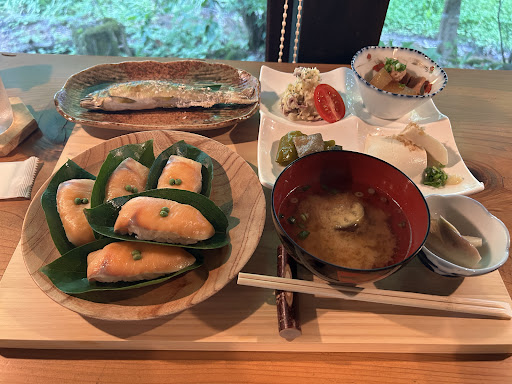 智頭町でランチスポットを妻がGoogleで検索して発見しました。 普段絶対行かないような狭い山道を登りトンネルを抜け、板井原集落という3人しか住人がいないらしい集落内にお店がありました。 ランチは1種類、柿の葉寿司と鮎の塩焼きがメインのセットでした。 店主お一人でされてるようで、だいぶん待つんだろうなって思い、古民家を改装したお店の内外を見回り、木のパズルをしながら待ちました(たぶん15分くらいかな?)。店員さんに「完成させるまで帰れませんよ!」と気さくに声かけていただき、料理は運ばれて来ました。 柿の葉寿司は初めてで「味は付いているので、そのまま召し上がってください」とのこと。「葉っぱもたべれるんかな?」って妻と会話してたら「葉っぱは食べれません!」と教えてもらい、いざ実食。 実は私はあまり生物が得意ではなく、食べた瞬間に生臭い匂いが口一杯に広がり…と思ったら、山椒の良い香りが生臭さを打ち消し、大変美味!5つも食べられないと思っていたけど、全て美味しくいただけました。鮎、冷奴、さつまいものポテトサラダ、お味噌汁も美味しかったけど、これまた苦手だった茄子とピーマンの煮物も大変美味しく、新しい発見をしたような感覚でした。アイスコーヒーとセットで2,200円でした。 夏の暑い日でしたが、板井原集落は大変涼しくて静かで、夏休みに田舎のおばあちゃんの家に来たような居心地で、また来たいと思いました。 次回は木...
