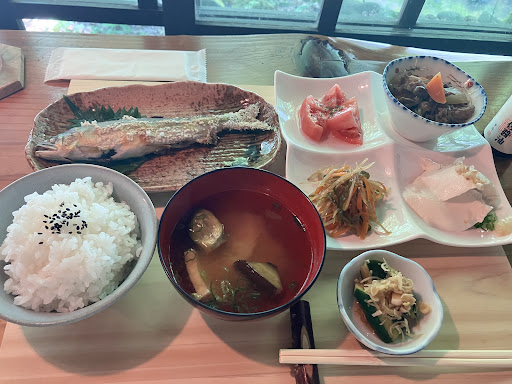 日により変わりますが、この日は鮎付きのランチでした。白米、茄子と油揚げの味噌汁、鮎の塩焼き、芦津豆腐、肉じゃが、トマトサラダ、きんぴらゴボウ、胡瓜と茗荷の浅漬け。どれも家庭料理ですが、丁寧に作り盛られていてお腹になります。