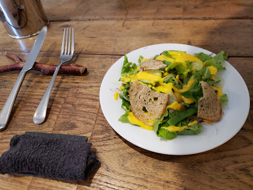 大自然に囲まれた場所に、ぽつんと現れる素敵なお店。お昼に伺い、ピザをシェアできるランチセットをいただきました。自家製ドレッシングのかかった鹿肉のサラダやかぼちゃのスープ、鹿肉のピザ、デザートのレモンタルト。どれも大変においしかったです。