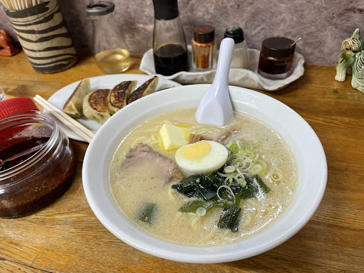 Read moreスナックの帰りにいつも友達と行くのですが、シンプルな味噌ラーメンにコーンをトッピングしたものを注文します。 カウンター上に置いてある瓶に入ったピリ辛調味料を入れると味噌味と合って結構美味しくなります。 ここのラーメンスープは味噌汁のような味もしてお酒を飲んだ後に食べると最高です。 車...